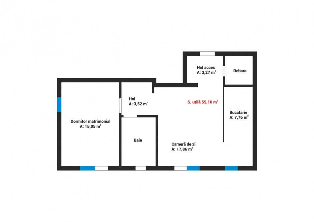 Apartamentul are suprafata utila de 55,10 mp, fiind compartimentat in urmatoarea dispunere: