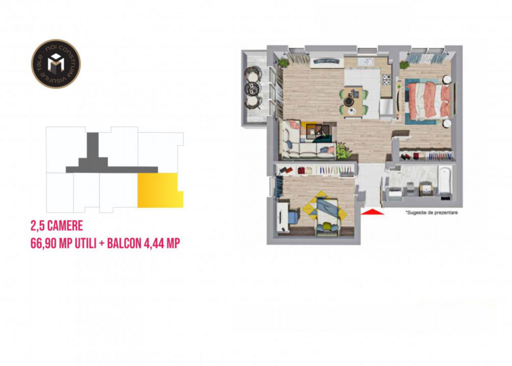 Iti prezentam o structura de apartament care are suprafața de 66,90 mp + balcon 4,44 mp, fiind compartimentat astfel: