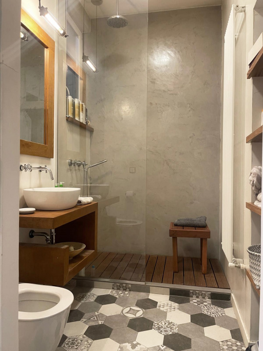 - Obiecte sanitare Premium – duș de tip walk-in, vas WC cu rezervor încastrat, lavoar, baterii;