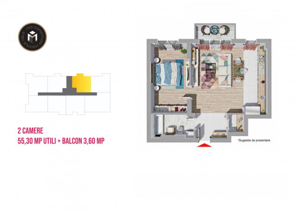 Iti prezentam o structura de apartament care are suprafața de 55,52 mp + balcon 3,87 mp, fiind compartimentat astfel: